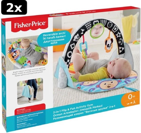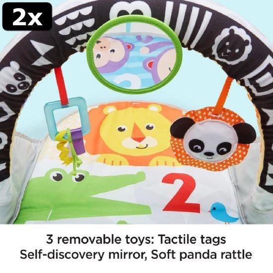Van op de rug spelen tot op de buik spelen, de Fisher-Price 2-in-1 Activity Gym is leuk vermaak voor kleine onderzoekertjes in de groei. De zachte speelmat kan in de wasmachine, heeft felle kleuren en zit vol met leuke dierenvriendjes waarmee je baby heerlijk op de rug kan spelen.