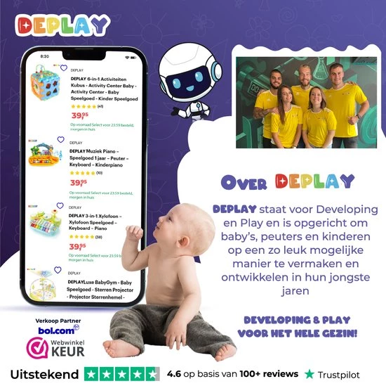DEPLAY staat voor Developing & Play en is opgericht om baby’s, peuters en kinderen op een zo leuk mogelijke manier te vermaken en ontwikkelen in hun jongste jaren. Heel het DEPLAY assortiment is Europees getest en voldoet daarmee aan de keurmerken. Veiligheid en betrouwbaarheid staat centraal en bezorgen jouw kindje niet alleen onwijs veel speelplezier, maar geven jou als ouder ook een gerustgesteld gevoel. Developing & Play voor het hele gezin!