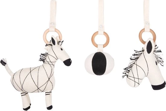 Set van 3 katoenen figuren (2 zebra’s en een bal) die aan een Babygym kunnen worden bevestigd. Houten gym niet inbegrepen.