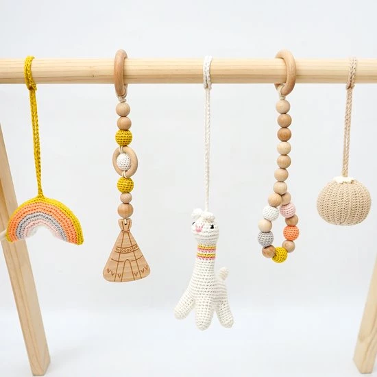 Om deze compleet te maken zitten er ook nog 2 houten speeltjes met kralenkettingen bij dus in totaal 5 hangende speeltjes!