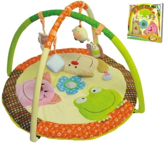 Op het speelkleed zijn vrolijke dieren afgebeeld.