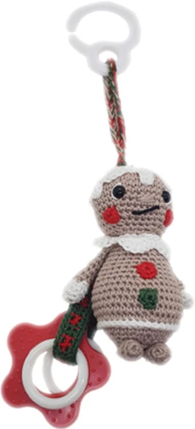 Dit leuke Gingerbread maxicosy speeltje is een eyecatcher aan iedere maxicosy en zeker heel leuk in de decembermaand. Het speeltje is eenvoudig te bevestigen. Niets is zo leuk als je baby/kindje wat plezier heeft. Je baby/kindje kan onderweg er mee spelen of gewoon naar kijken. De hanger stimuleert de fijne motoriek van de baby/kindje. In het lijfje zit een rammelkraal waardoor het speeltje geluid maakt als de baby/kindje er mee speelt. De hanger stimuleert het kindje te focussen, te grijpen naar het speeltje en te luisteren naar het rammelende belletje. De maxicosy hanger is gemaakt van 100% Catania katoen, heeft een plastic bijtring en een makkelijke ophangring.
