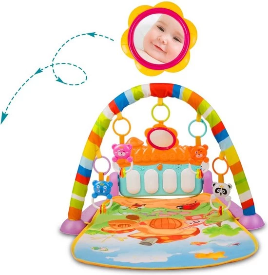 Dit interactieve speelkleed piano is super voor jouw kindje! Doordat het speelkleed heerlijk zacht is ligt je kindje comfortabel. Aan de speelboog hangen verschillende leuke speeltjes met rateltjes en een spiegeltje waar je kindje in kan kijken. Al liggend op de rug kan je kindje heerlijk tegen de pianotoetsen aan trappen om muziek te maken onder begeleiding van vrolijke lichteffecten.