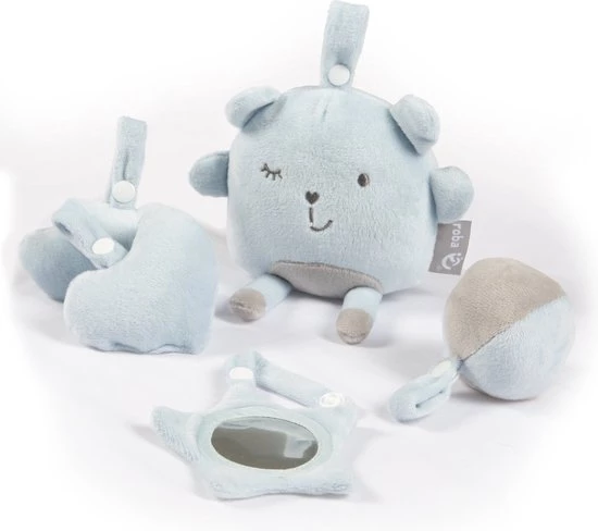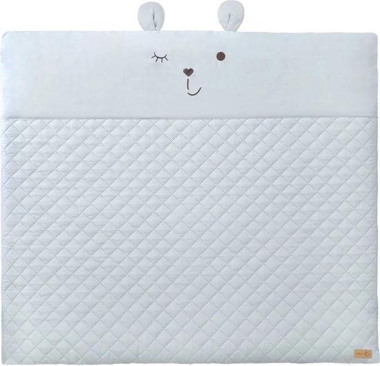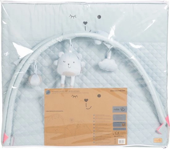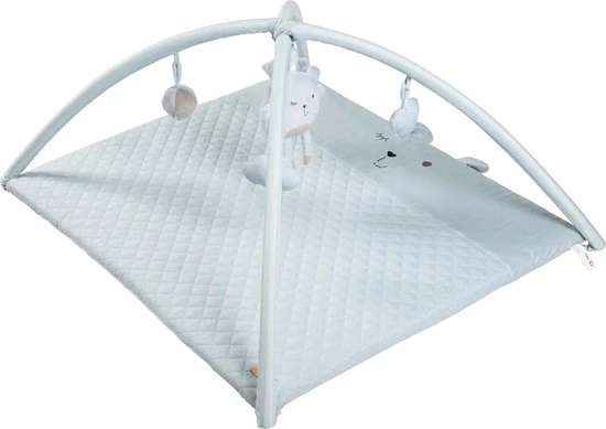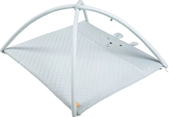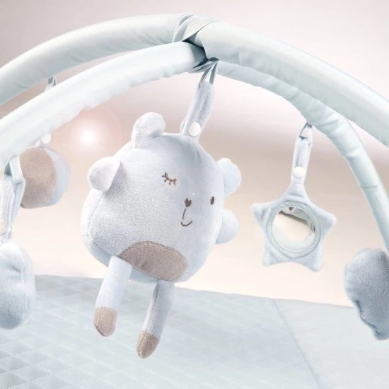 Dit speelkleed heeft een schattig gezicht en twee oortjes van ‘Sammy’ de beer. De bogen zijn voorzien van vijf speelelementen, waarvan drie speeltjes geluid maken. De schattige sterhanger is voorzien van spiegelfolie en het stoffen beertje Sammy bungelt met een vriendelijke glimlach in het midden van de speelbogen. Deze speelelementen leren je kindje spelen, grijpen en trainen de hand-oog coördinatie. Dankzij de verwijderbare speelbogen en de water- en vuilafstotende coating kan je het speelkleed ook gebruiken als aankleedkussen.