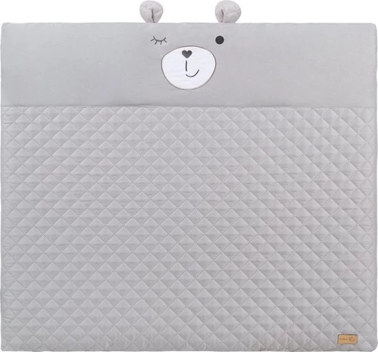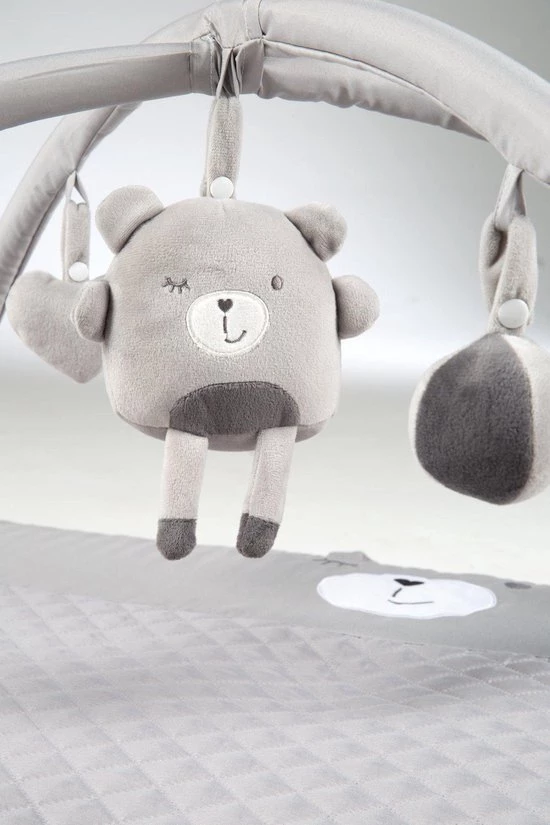 Dit speelkleed heeft een schattig gezicht en twee oortjes van ‘Sammy’ de beer. De bogen zijn voorzien van vijf speelelementen, waarvan drie speeltjes geluid maken. De schattige sterhanger is voorzien van spiegelfolie en het stoffen beertje Sammy bungelt met een vriendelijke glimlach in het midden van de speelbogen. Deze speelelementen leren je kindje spelen, grijpen en trainen de hand-oog coördinatie. Dankzij de verwijderbare speelbogen en de water- en vuilafstotende coating kan je het speelkleed ook gebruiken als aankleedkussen.