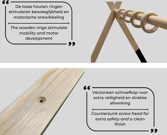 De babygym heeft een moderne en leuke uitstraling, de houten boog zal mooi staan bij jouw interieur, het ontwerp is tijdloos en stijlvol.De hoogte van de speelboog is verstelbaar, zo heb je altijd de perfecte hoogte waar jouw baby bij kan en kun je er extra lang plezier van hebben. Ook wanneer jouw baby groeit.